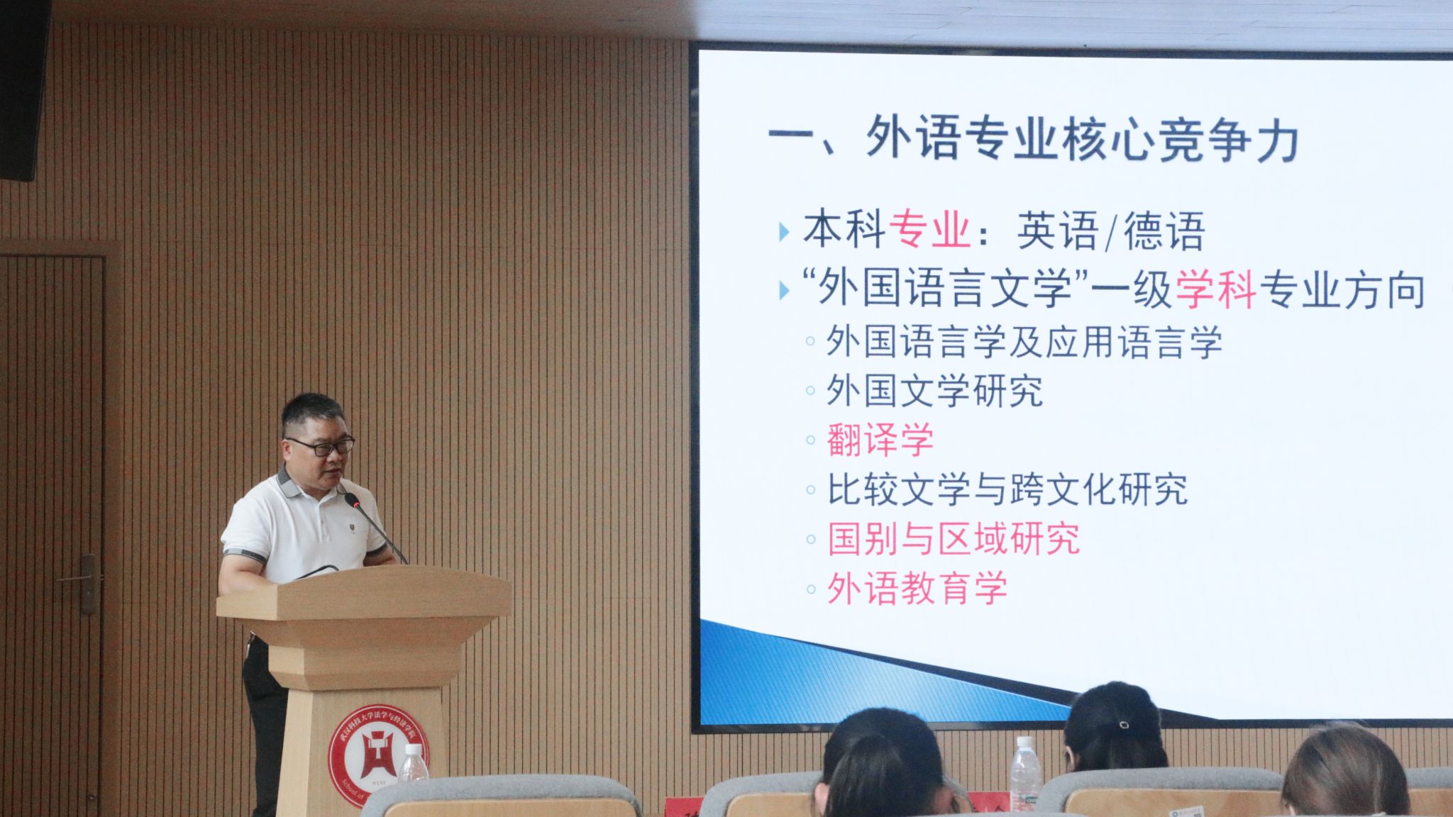 陳堯圍繞外語專業的培養理念,從專業學科關系、核心方向、方案調整與競爭力四個方面展開解讀。在培養方案優化上,他介紹英語專業新增叁個方向,“第二或第叁學期開始分流,核心課程各方向共有且可互通”;德語專業則大幅增加英語教學課程,由原來的3-4門、7學分增至6門、10學分,以實現德語與英語能力的協同發展。